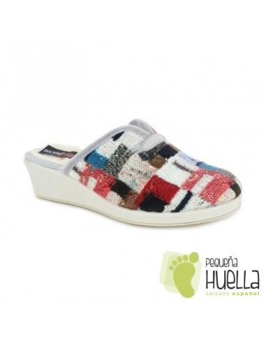 Zapatillas de mujer para estar por casa con cuña y abiertas por detrás. Perfectas para tener los pies calientes y cómodos en los fríos días de otoño-invierno. Zapatilla de andar por casa para señora disponible en multicolor, muy cómodas y fáciles de calzar. Calzado confortable para el día a día y un auténtico placer para tus pies al llegar a casa tras un día ajetreado.