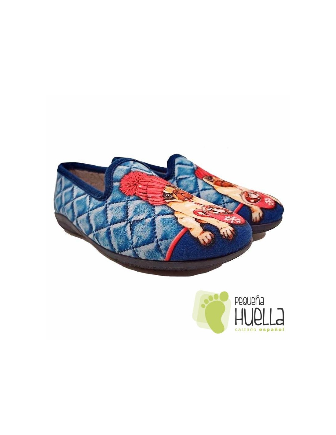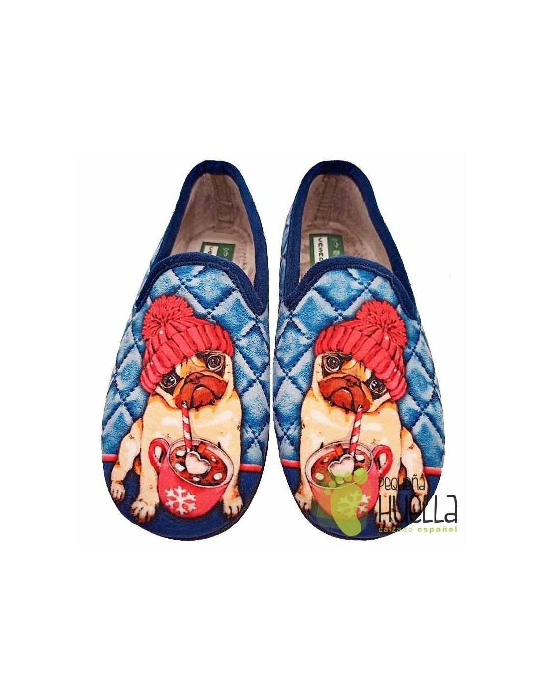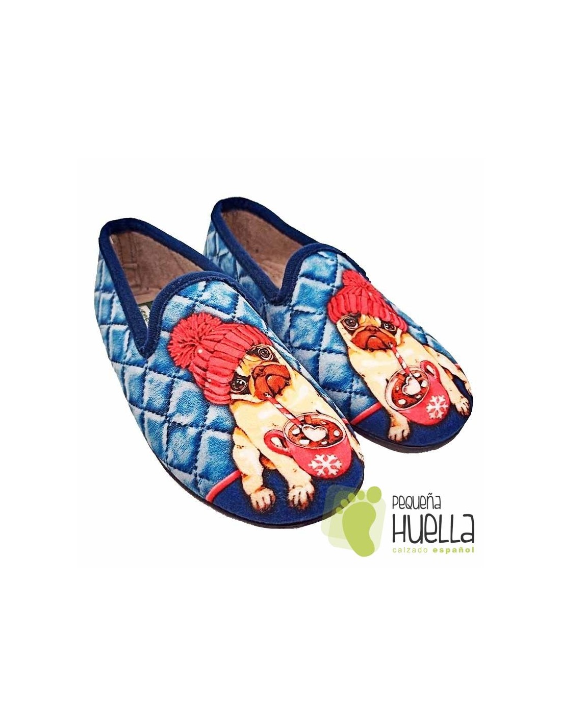 Bonitas zapatillas estampadas con un divertido perrito tomando café sobre el empeine. Babuchas con cuña baja cerradas para chica en suave suapel. Confortables y calentitas para el otoño e invierno.