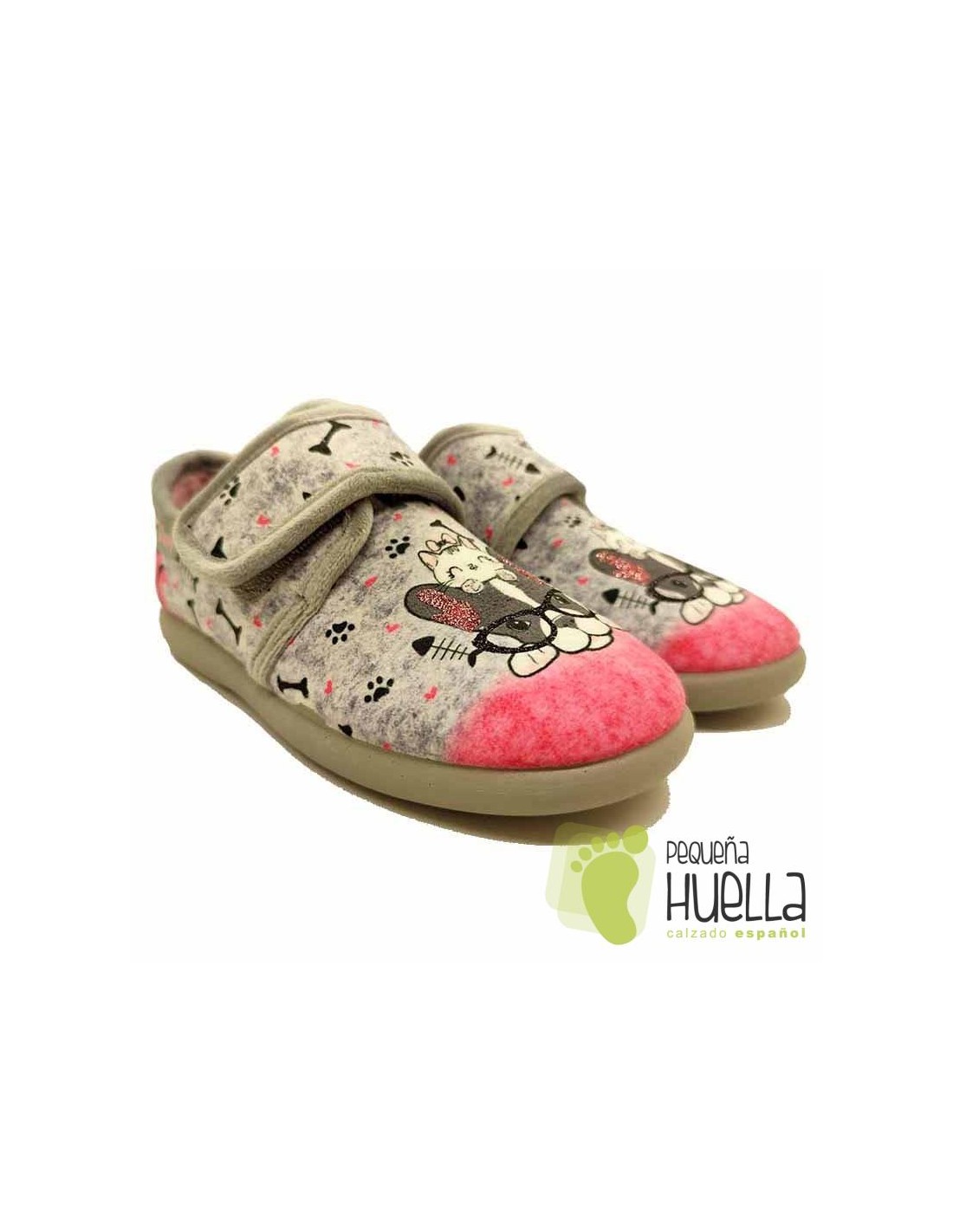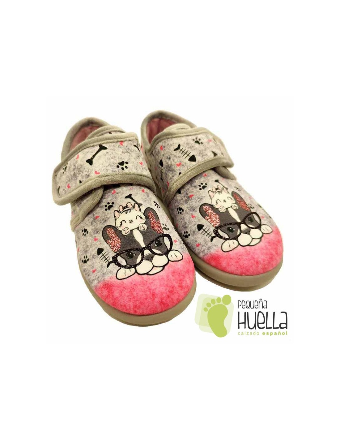 Babuchas de andar en casa para bebés y niñas Zapy. Babuchas con velcro para estar por casa de paño decorado motivos perrita con gafas