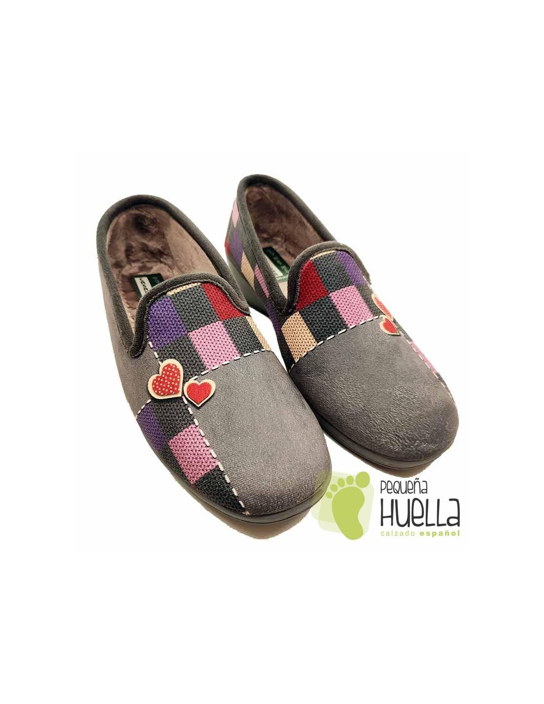 Zapatillas de casa con cuña para mujer cerradas con motivos de arlequín. Alpargatas de andar por casa suaves de suapel y anchas.