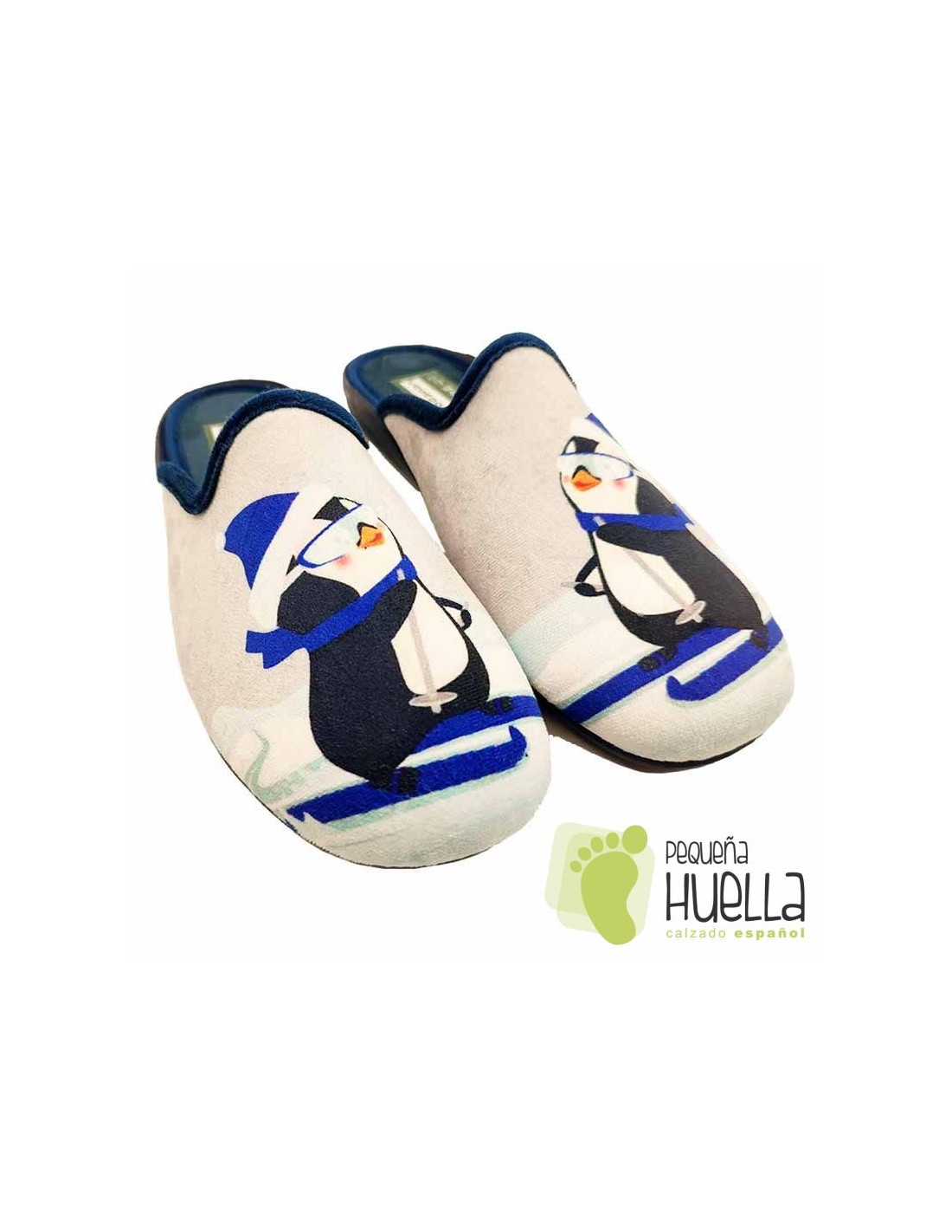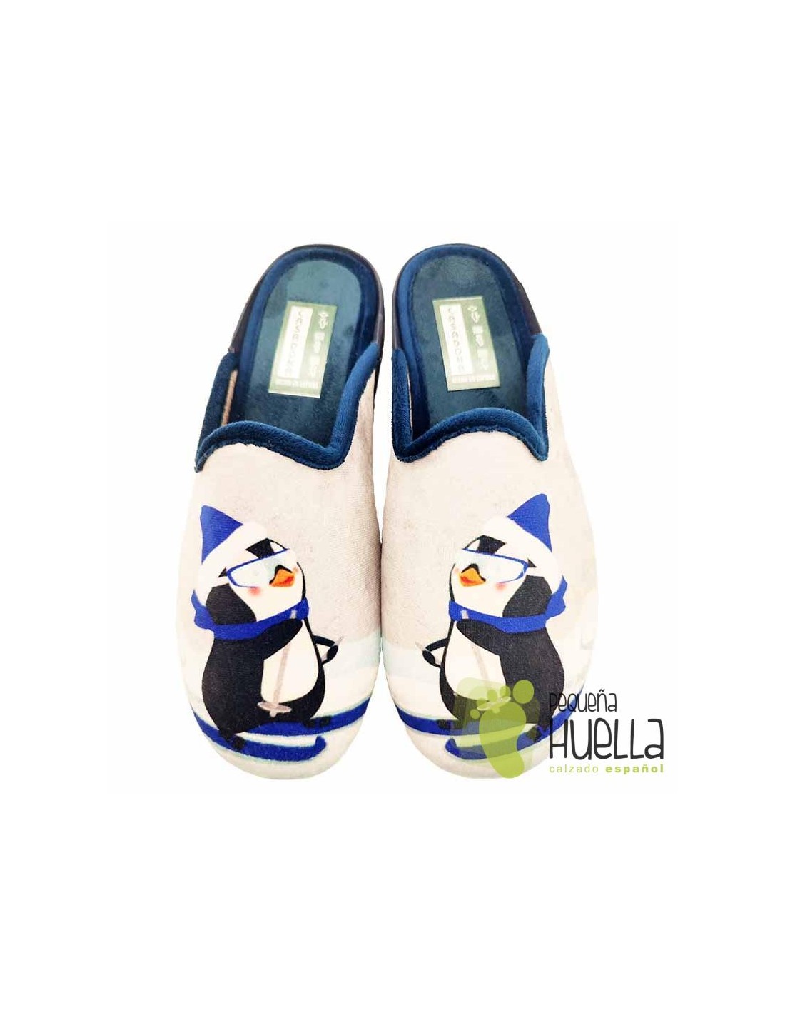 Chinelas con estampado con un pingüino. Babuchas destalonadas para mujer en suave suapel. Cómodas y calentitas para el otoño e invierno.