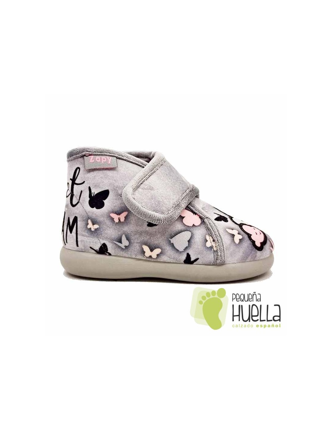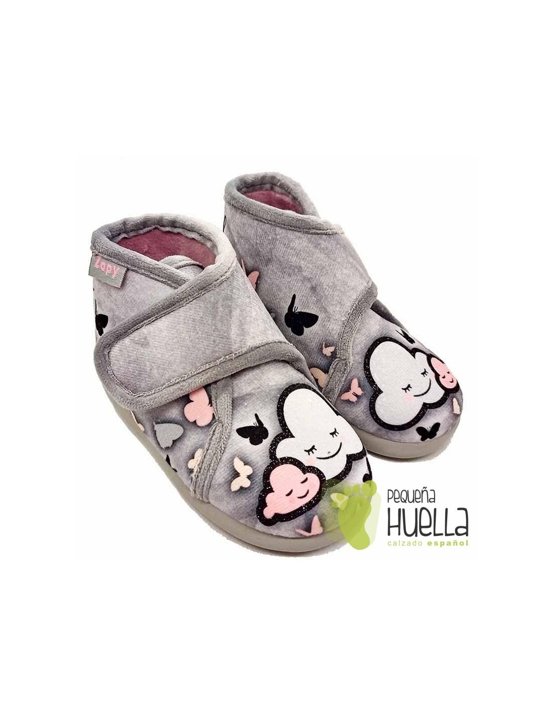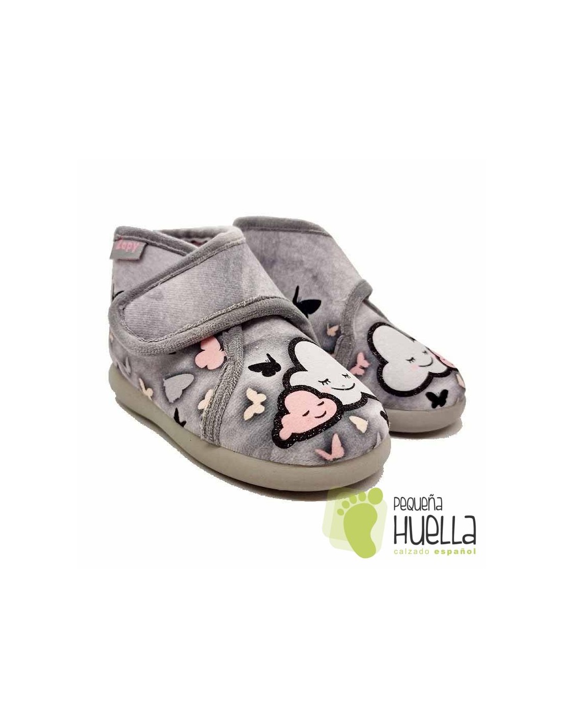 Botas grises de andar por casa para niñas Zapy. Zapatillas con velcro para estar por casa de suapel decorado con nubes.