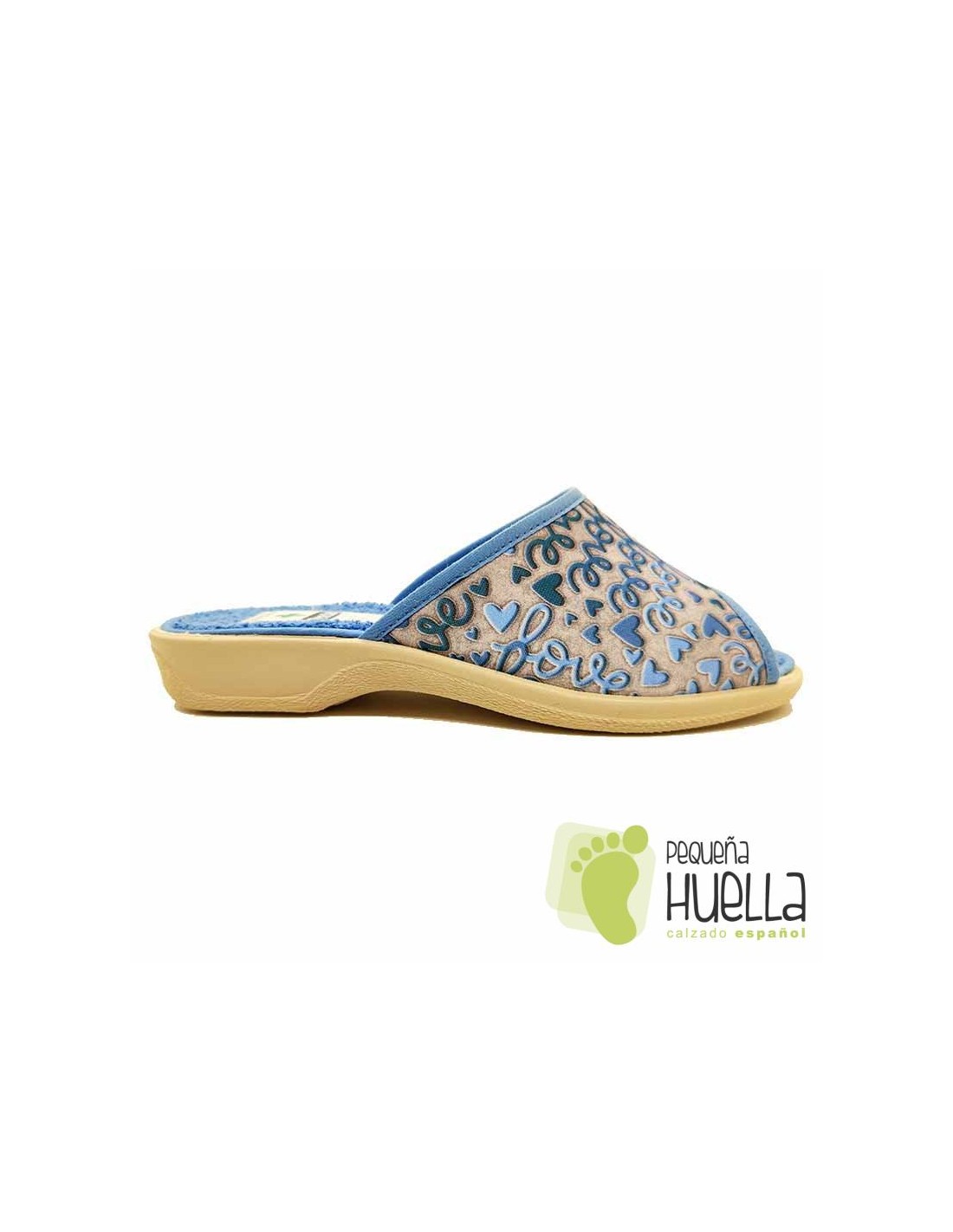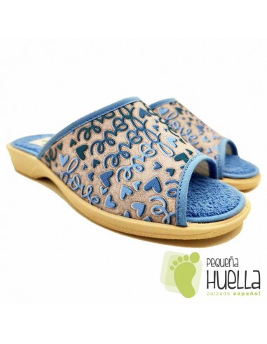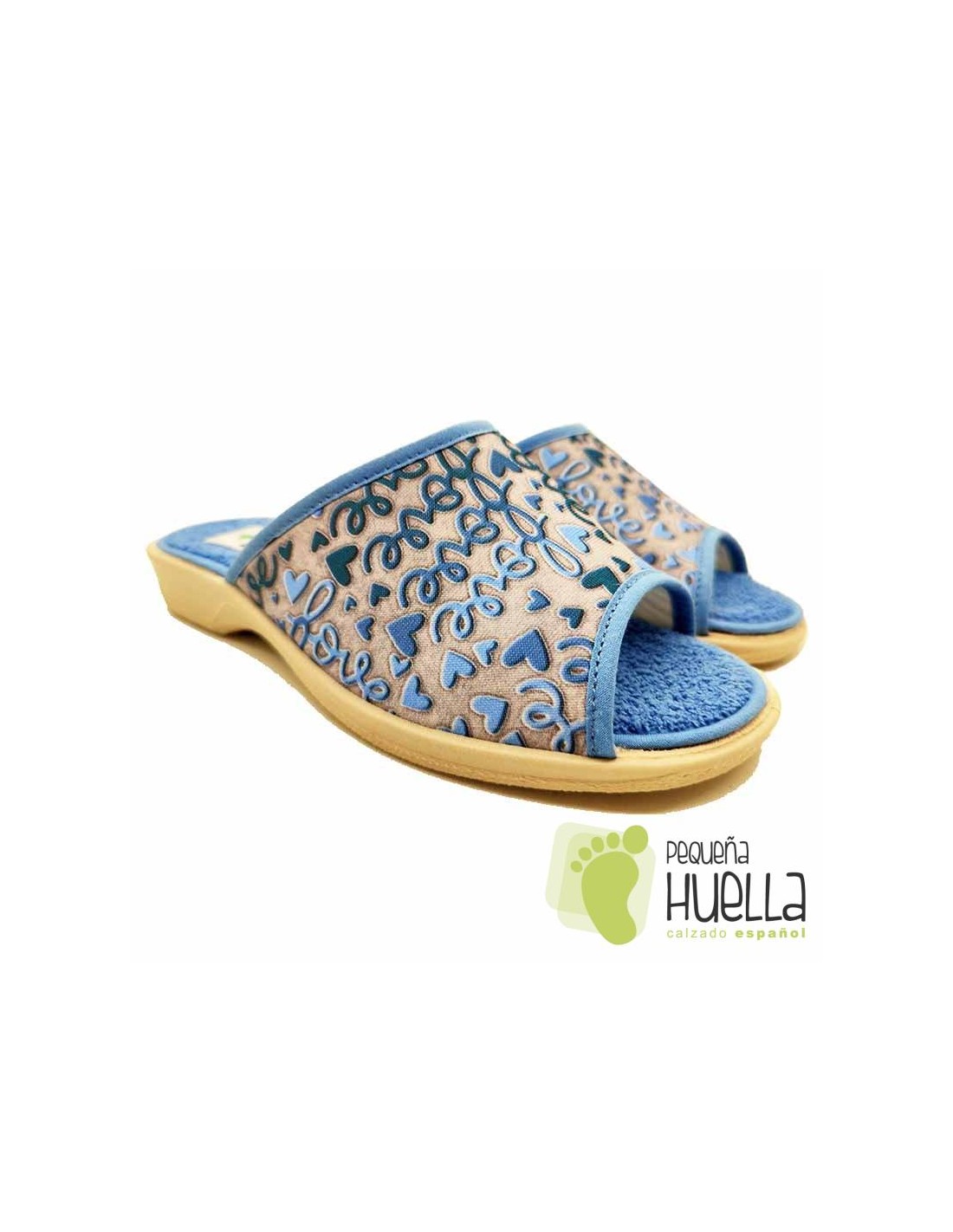 Disponibles en toalla color azul con motivos love y corazones. Unas chinelas anatómicas con los dedos al aire muy cómodas para el verano.
