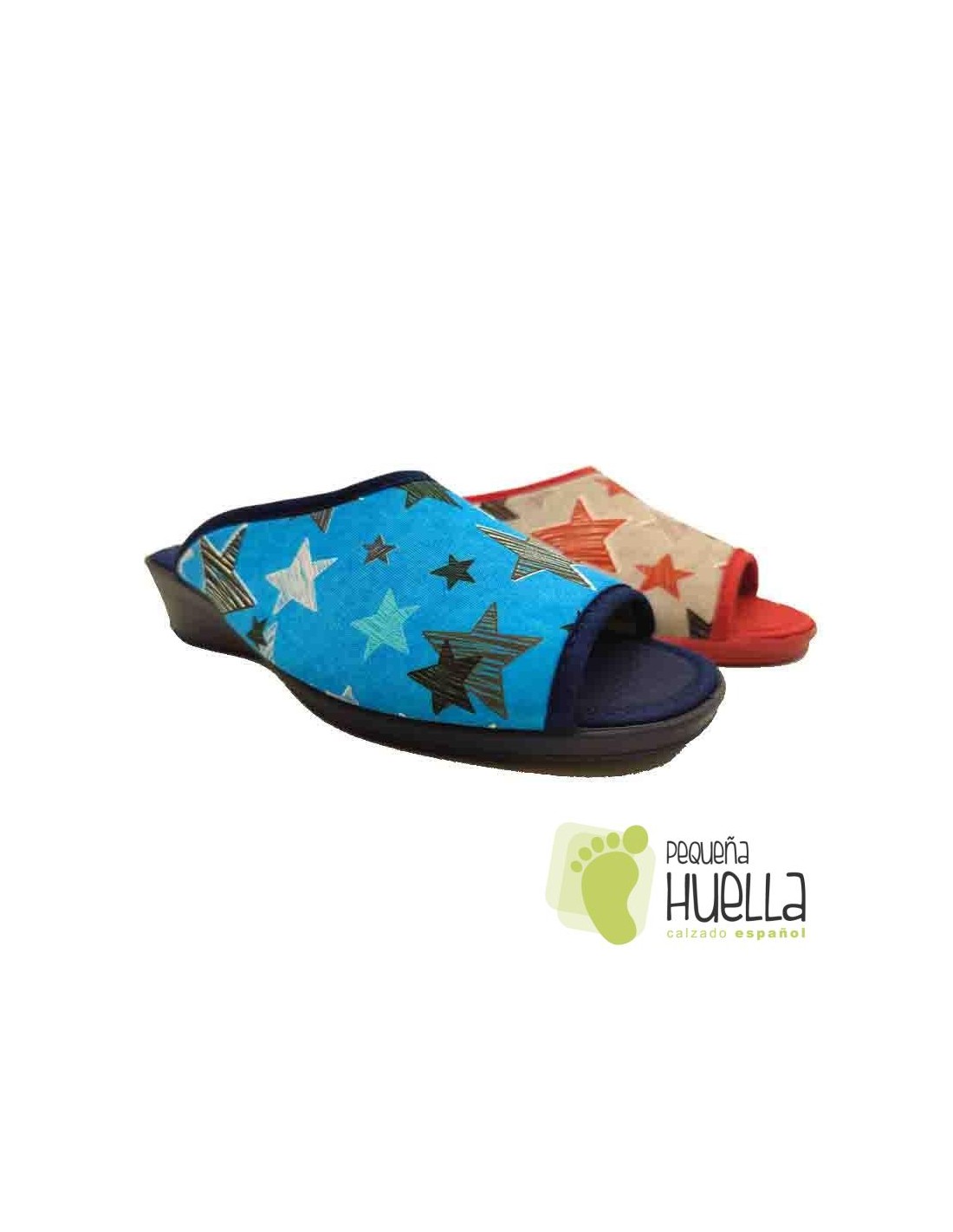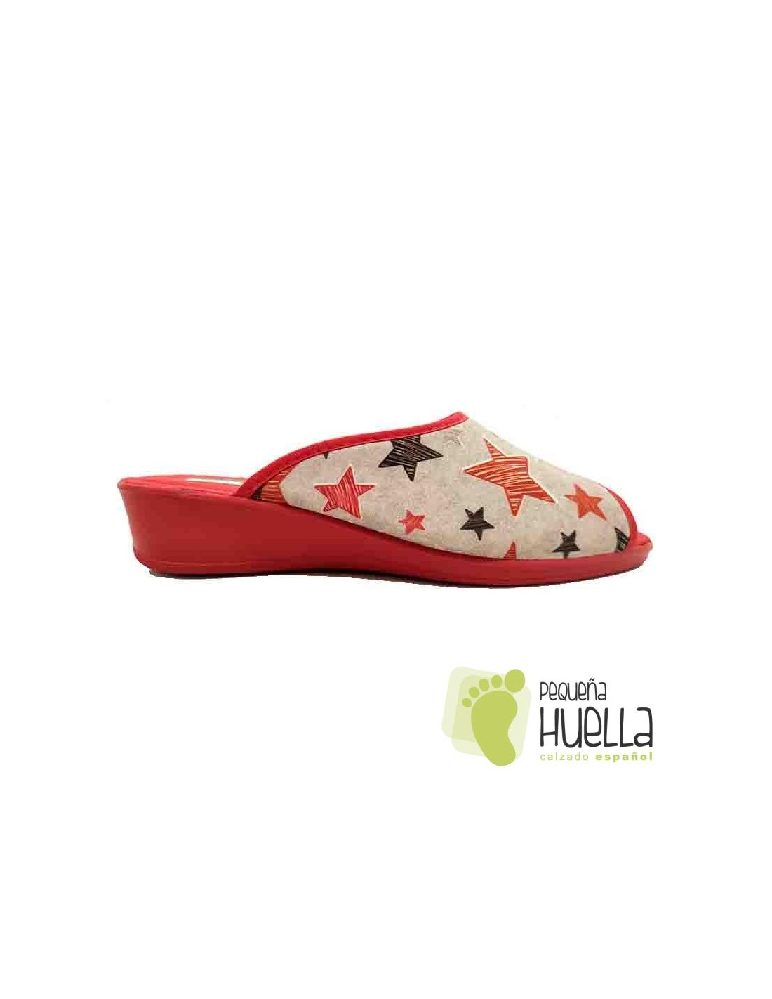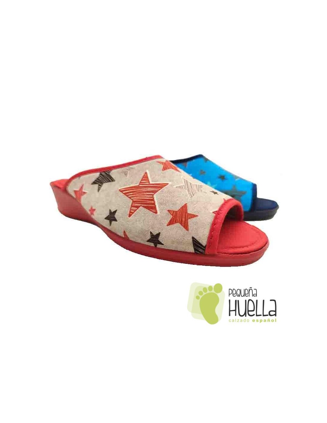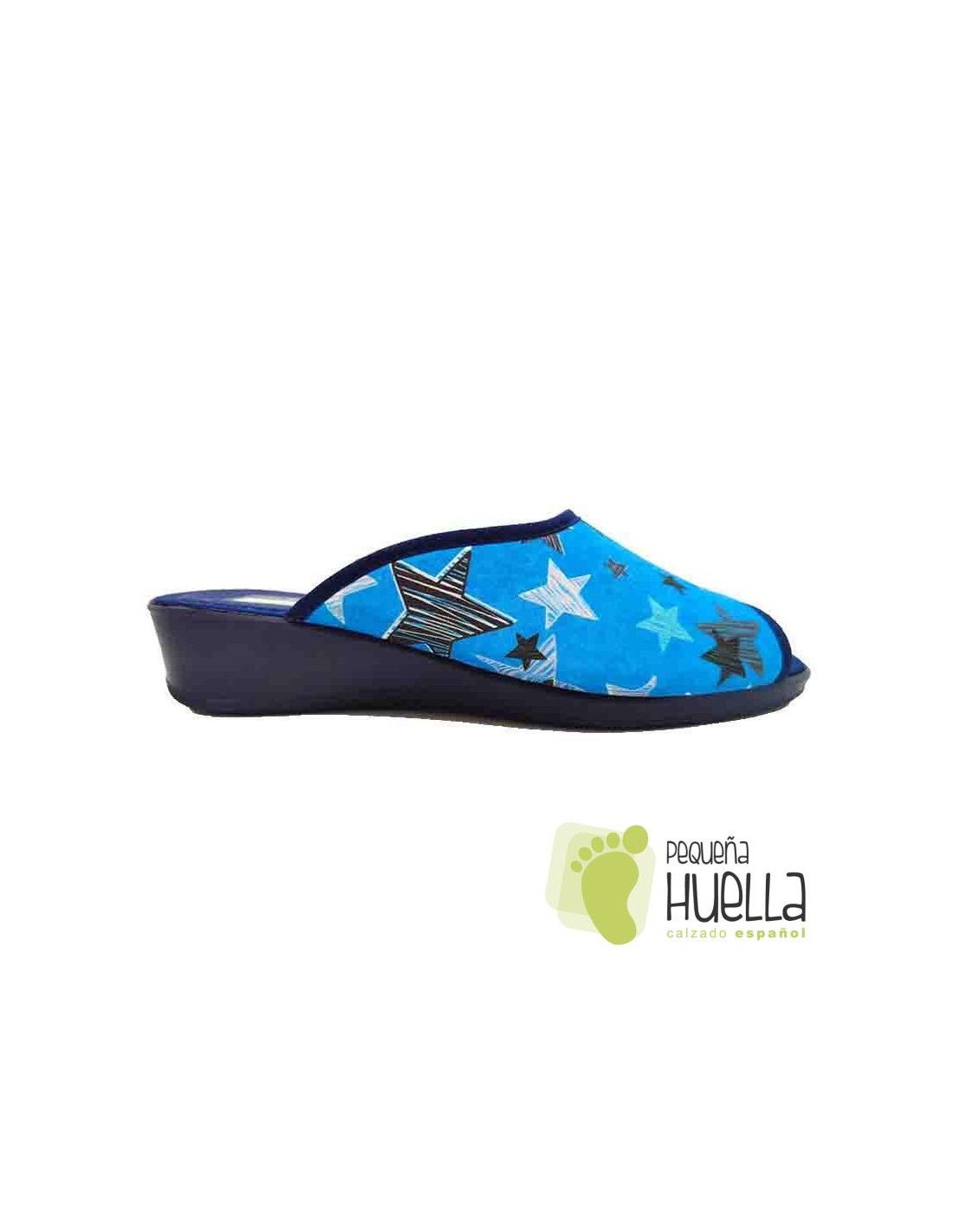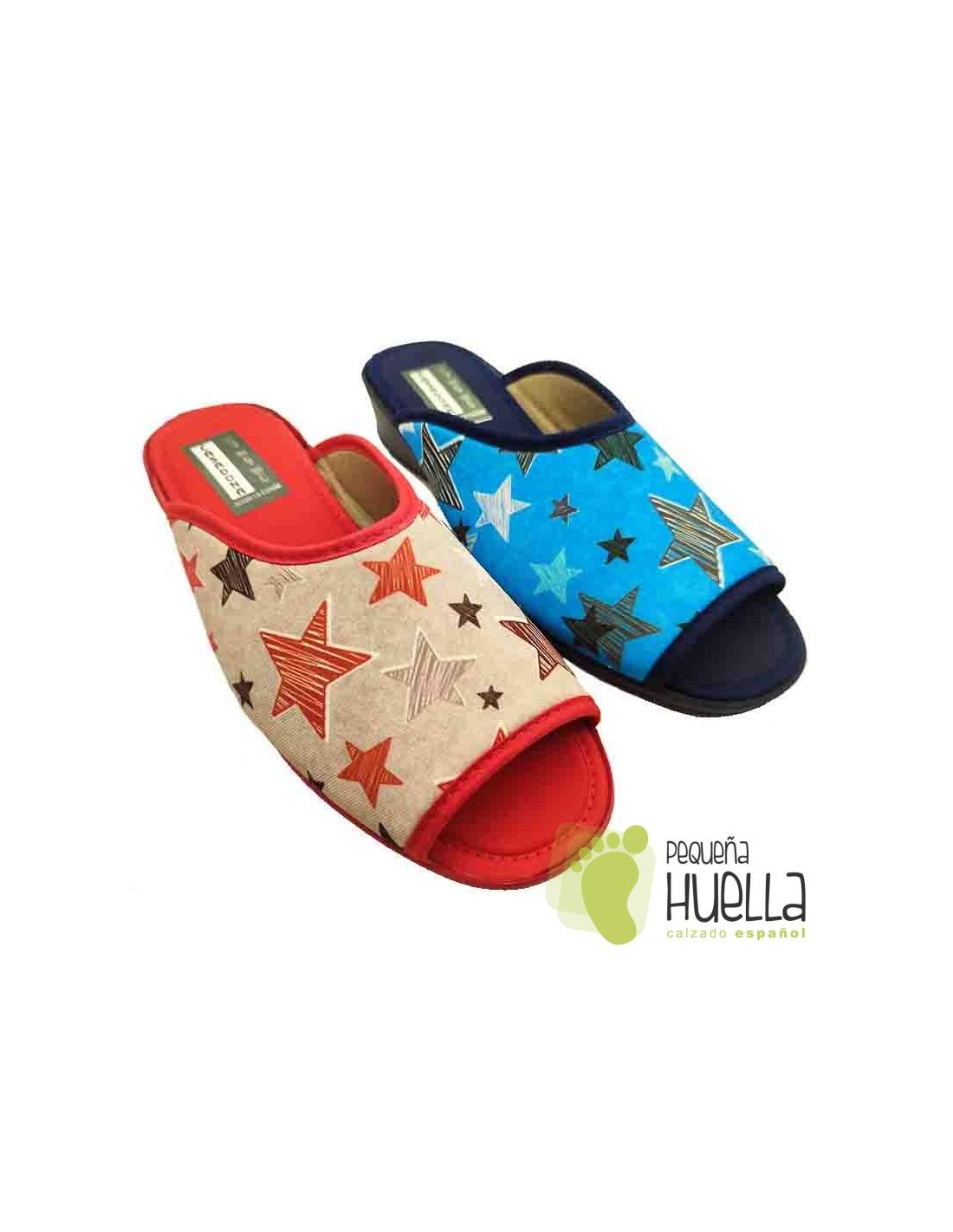 Bonitas zapatillas estampadas con estrella sobre el empeine. Babuchas con cuña destalonadas para señora suaves . Confortables y fresquitas para el verano.