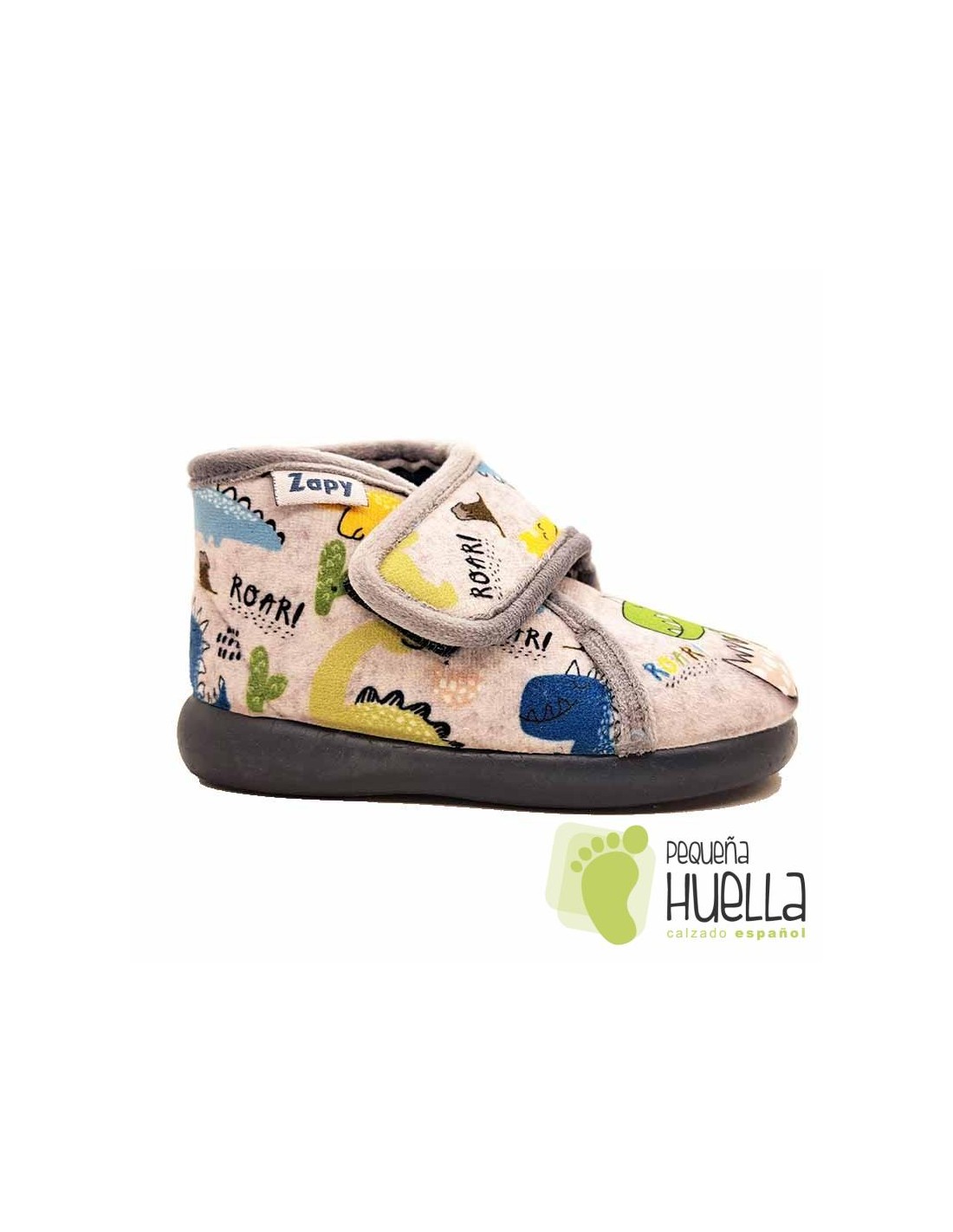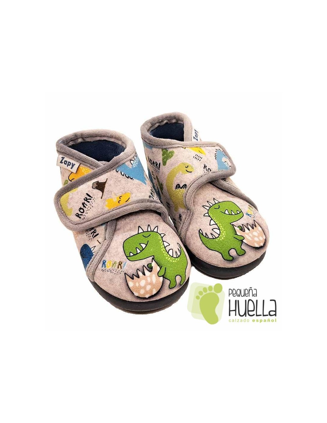 Zapatillas de estar en casa para bebés, niños y niñas Zapy. Botitas con velcro para andar por casa de paño decorado motivos de dinosaurios.