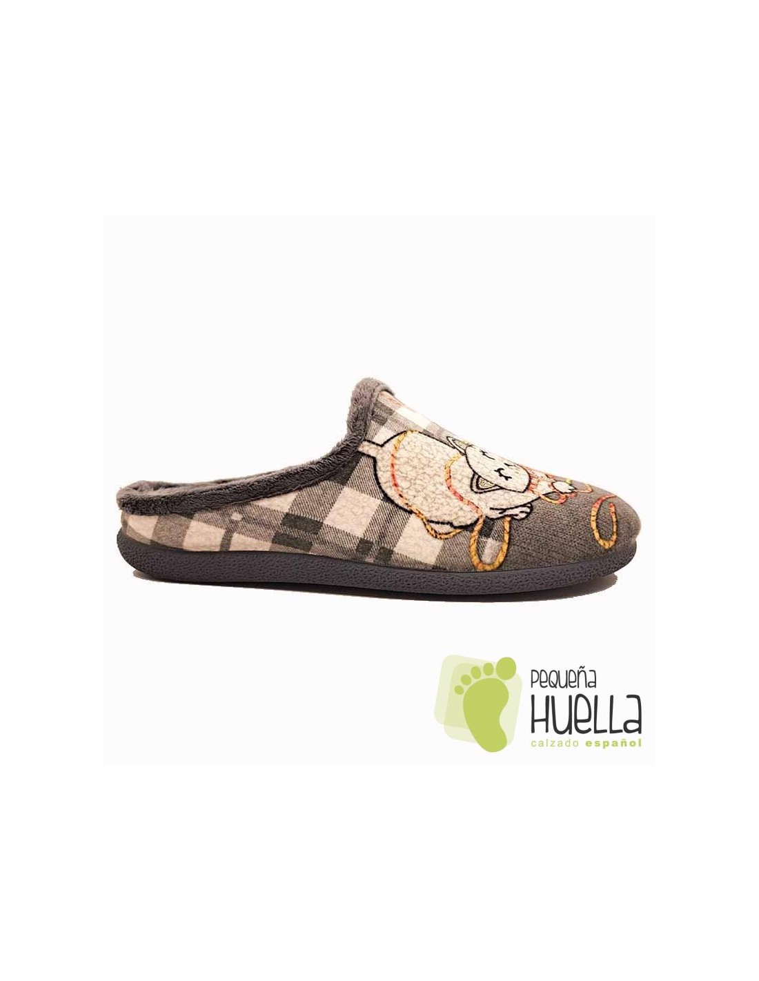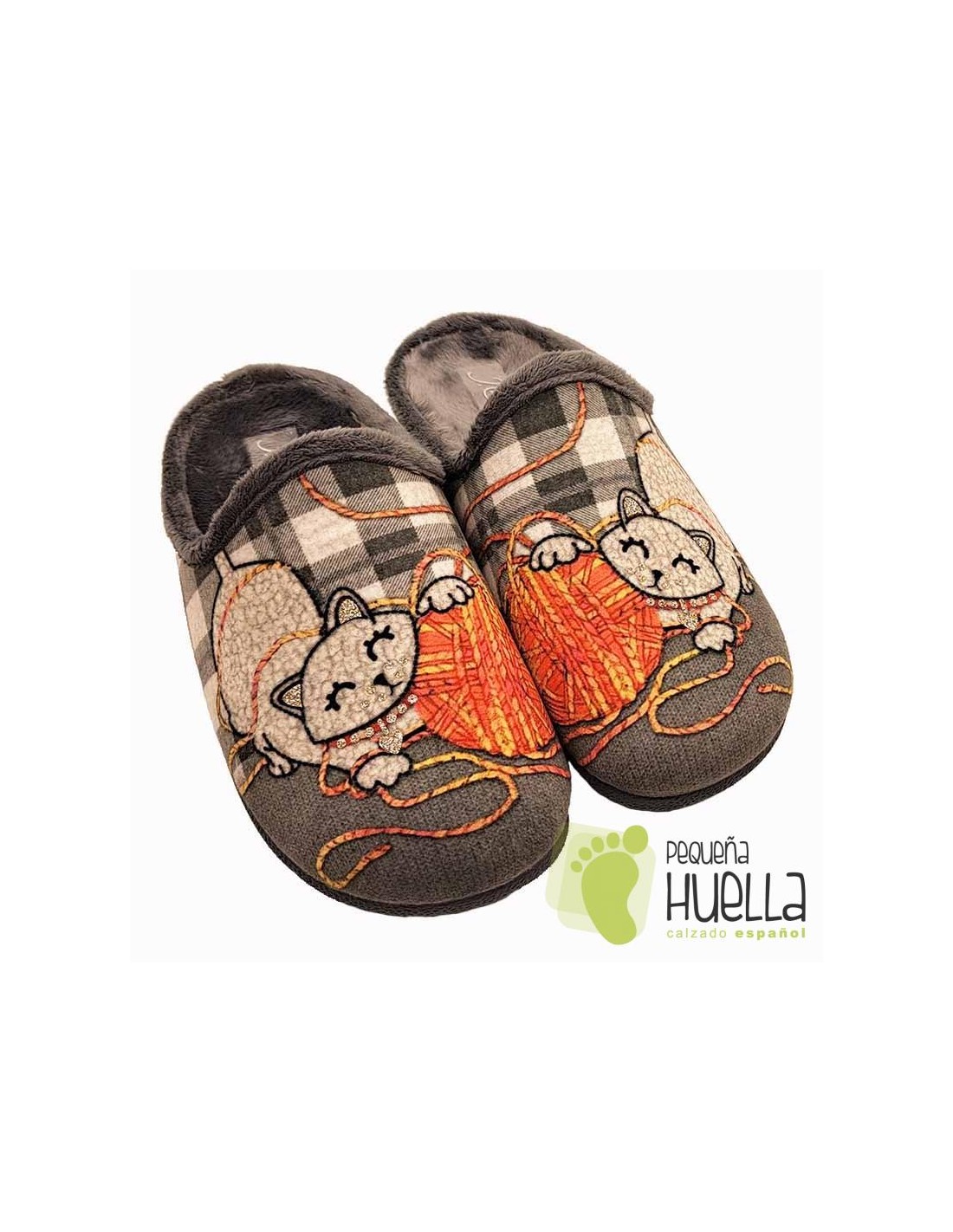 Zapatillas de casa abiertas por detrás con piso de goma con poca cuña para chicas. Cómodas y divertidas pantuflas para andar por casa decorada con gatos