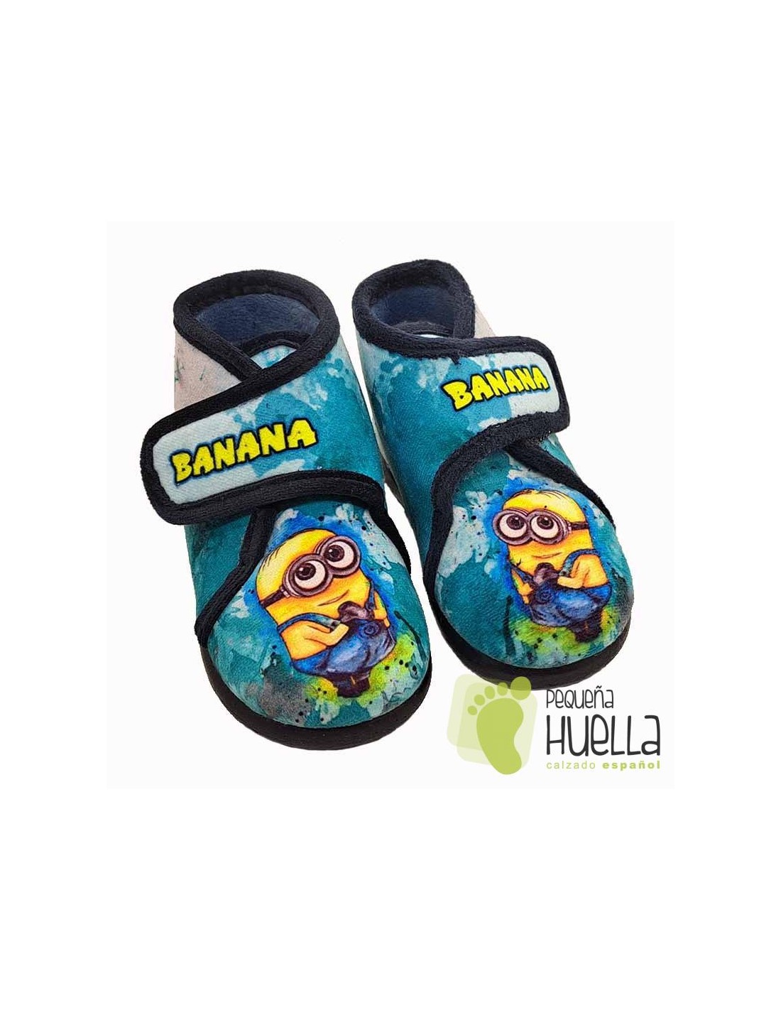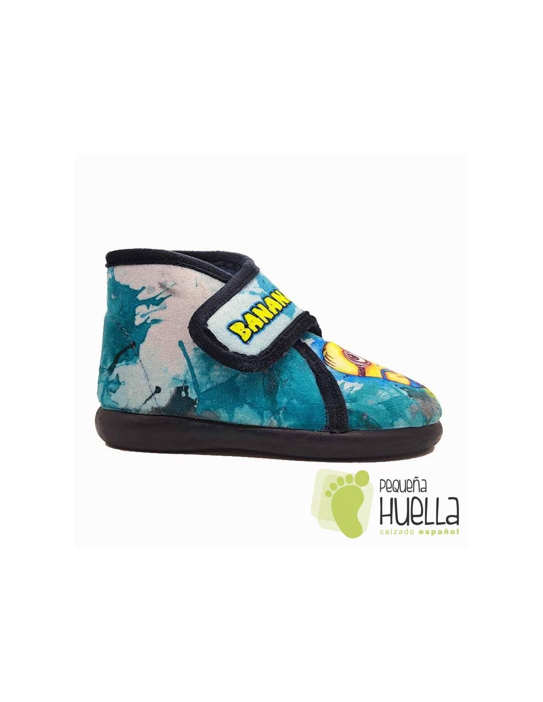 Zapatillas de estar en casa para bebés, niños y niñas Zapy. Botitas con velcro para andar por casa de paño decorado motivos de Minions .