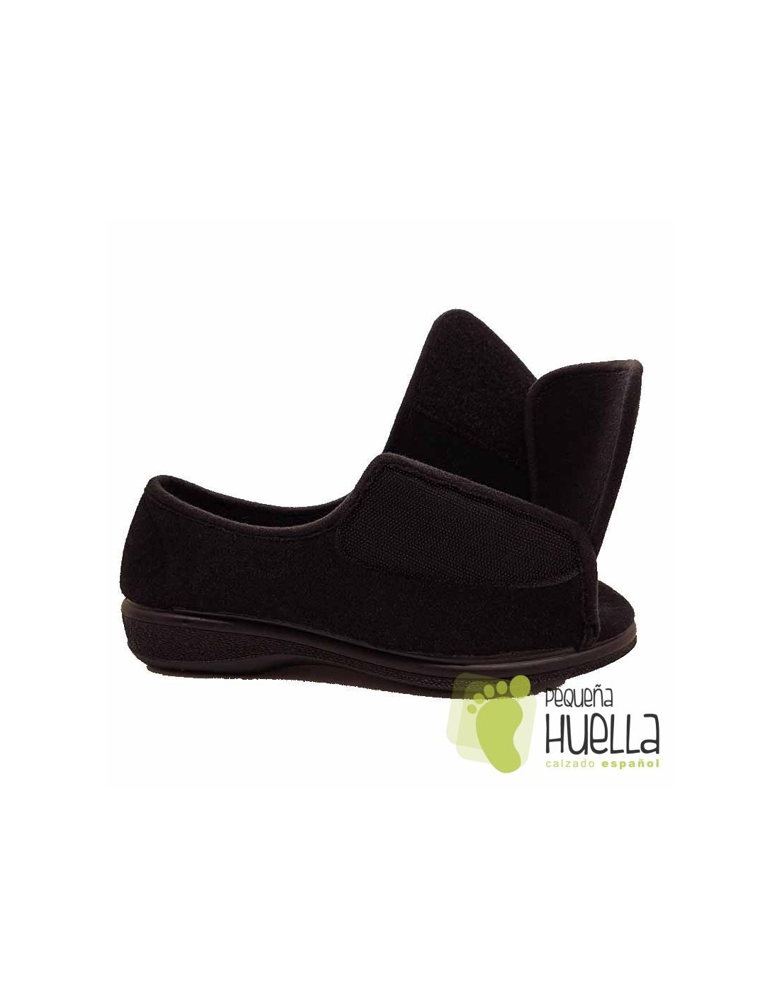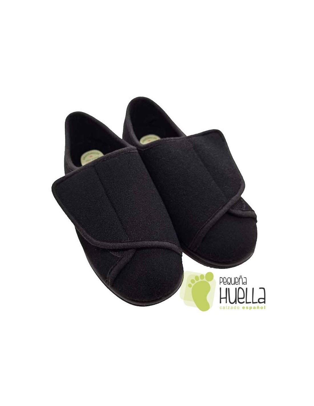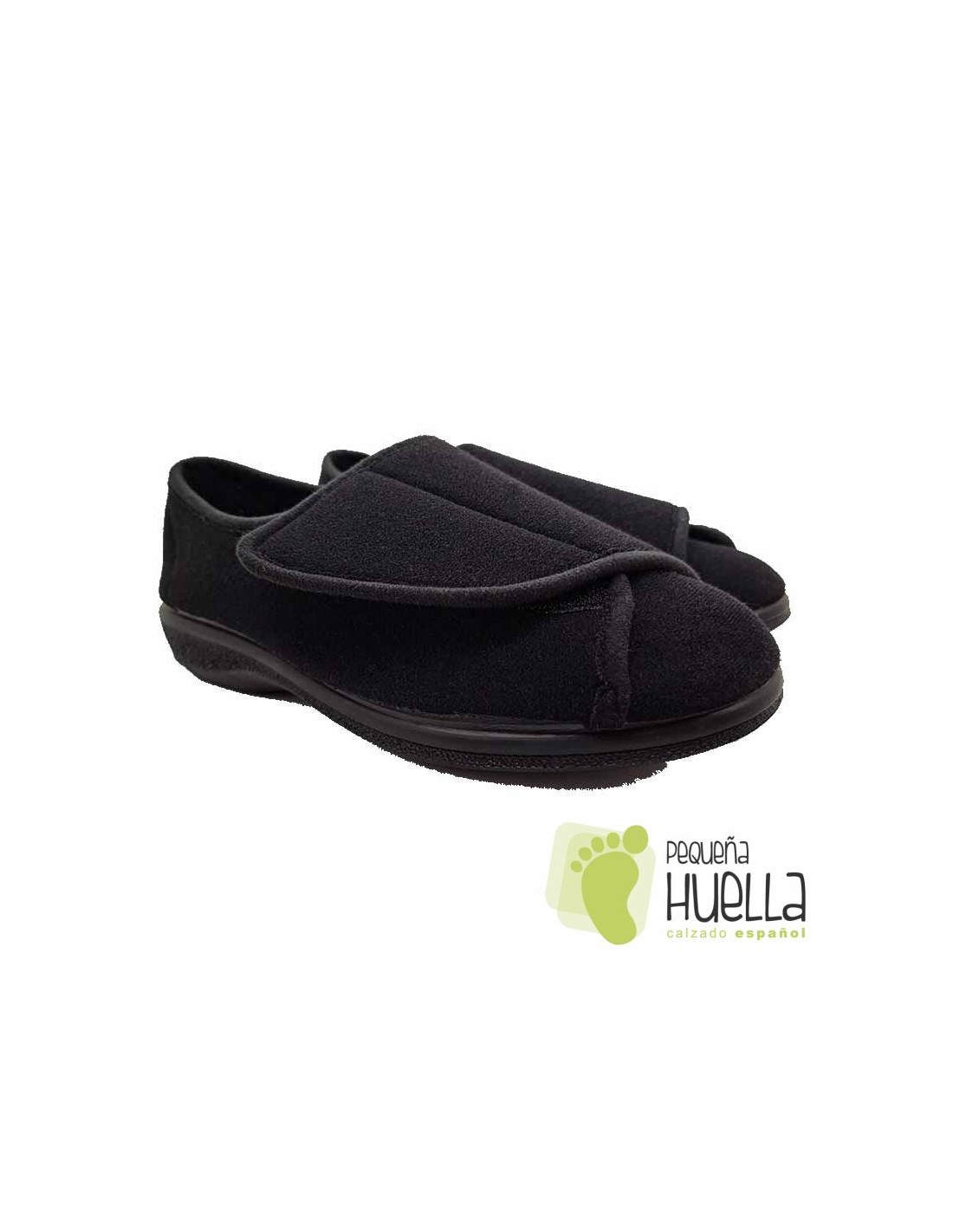 Zapatillas anatómicas para la calle o para casa de Señora en tejido de paño negro. Gran apertura para pies operados o pies hinchados o anchos. Horma ancha y se ajustan perfectamente con tres velcros sobre el empeine. Zapatillas de mujer muy fáciles de calzar y quitar, en especial para las personas operadas.