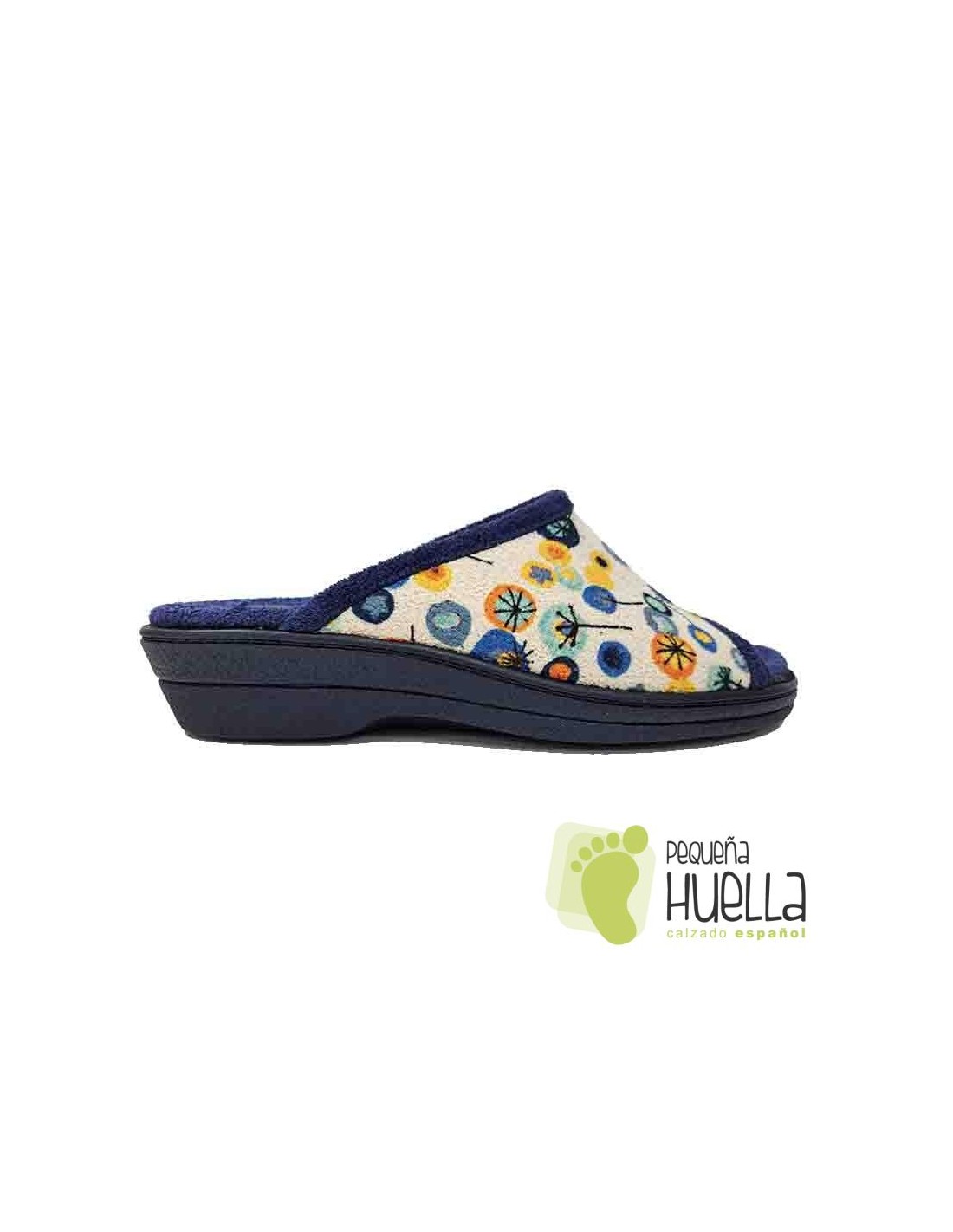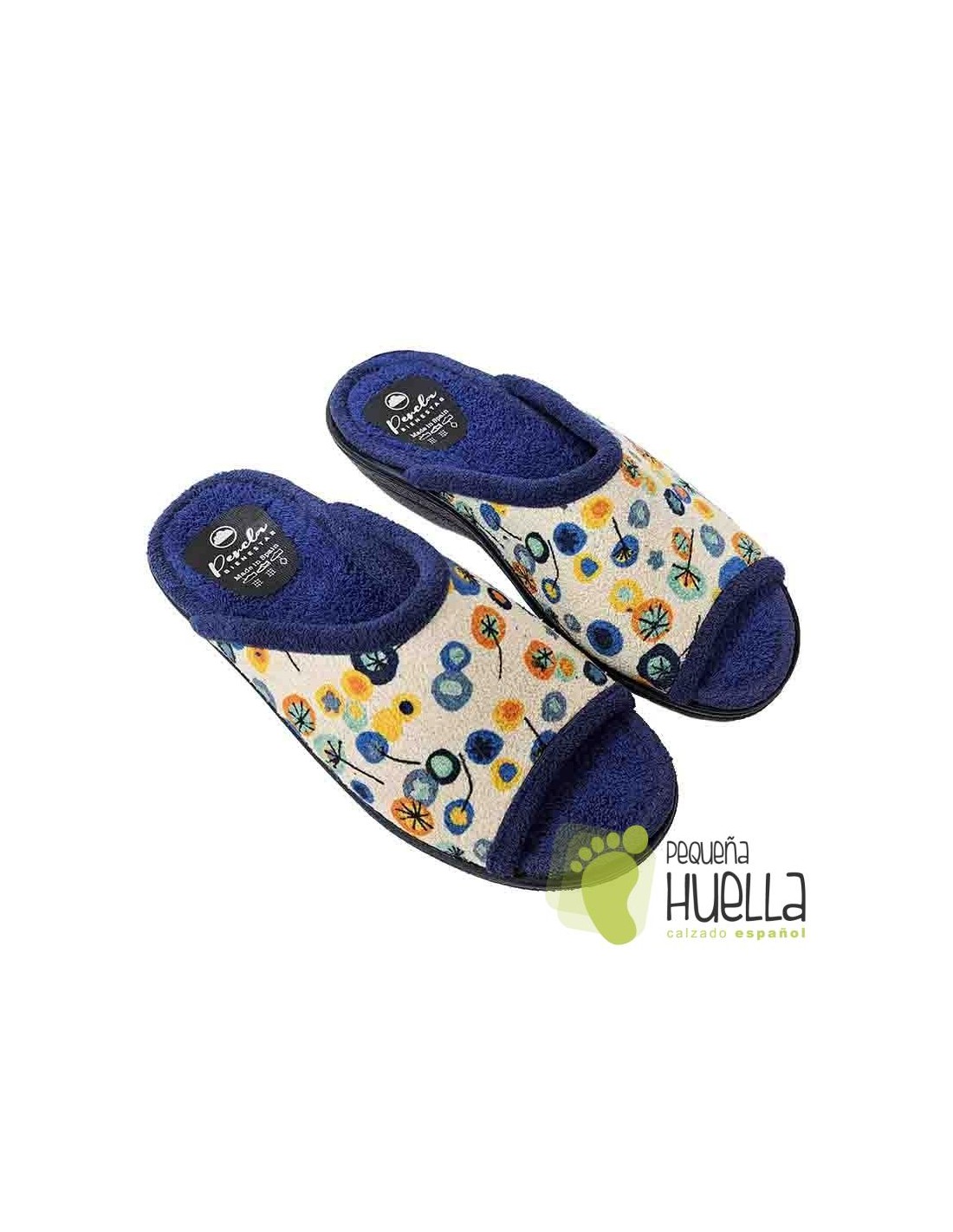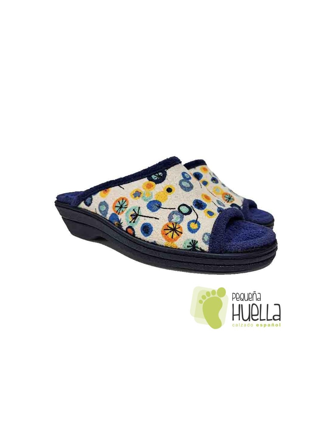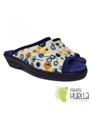 Disponibles en toalla azul marino con flores. Unas chinelas anatómicas con los dedos al aire de casa muy cómodas para el verano.