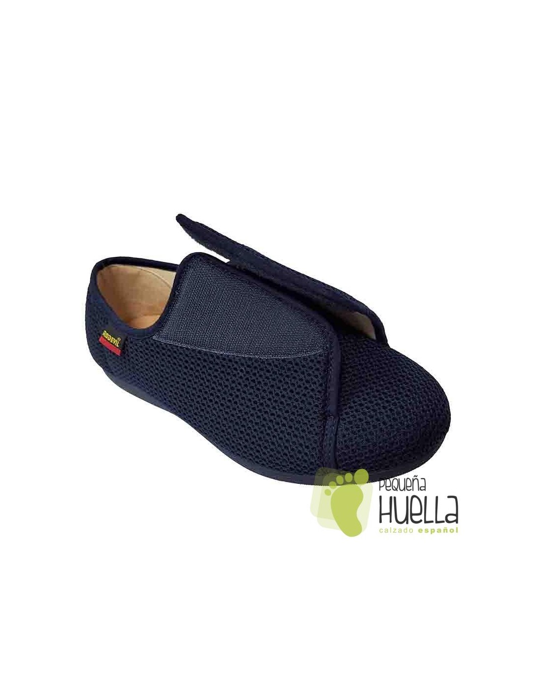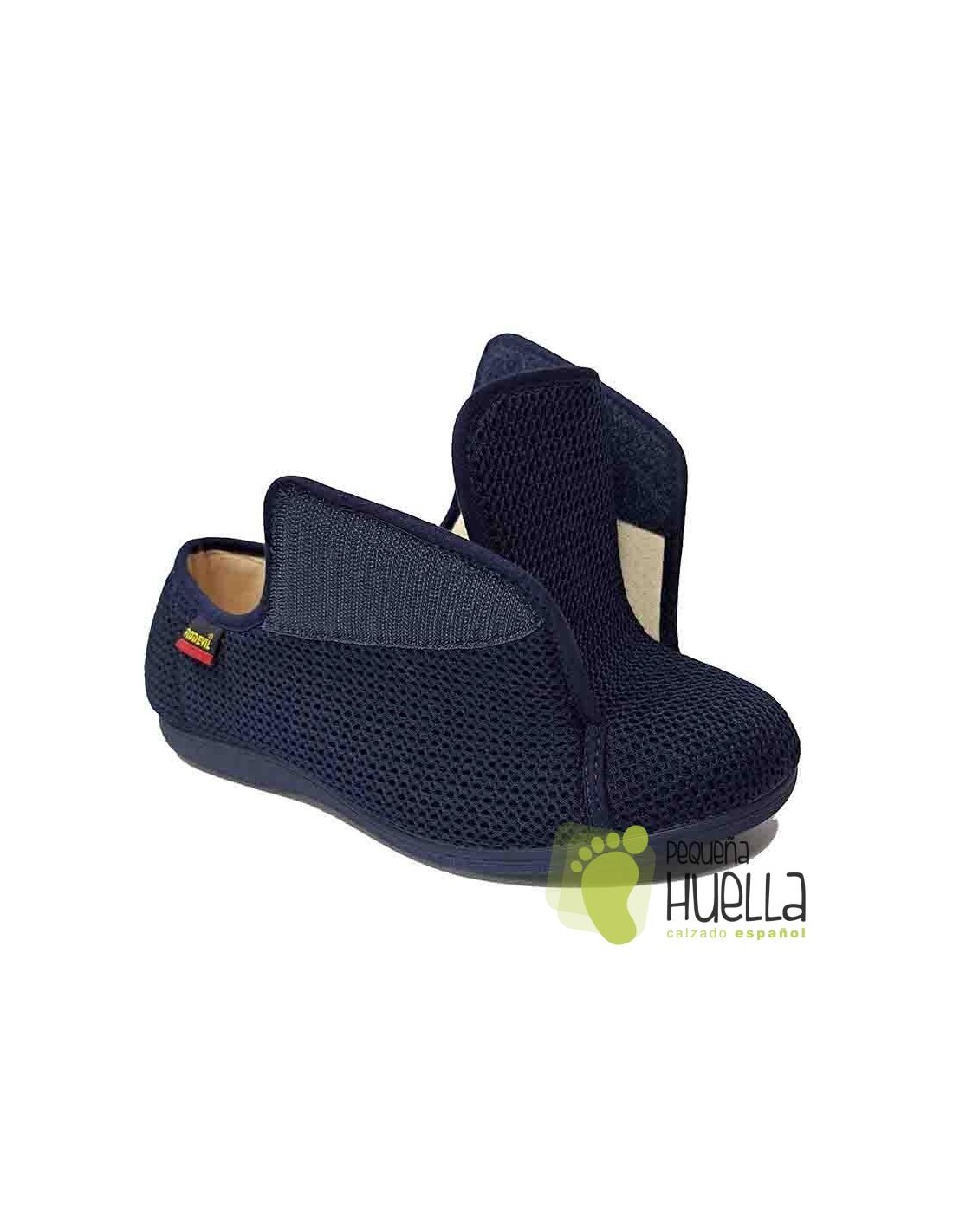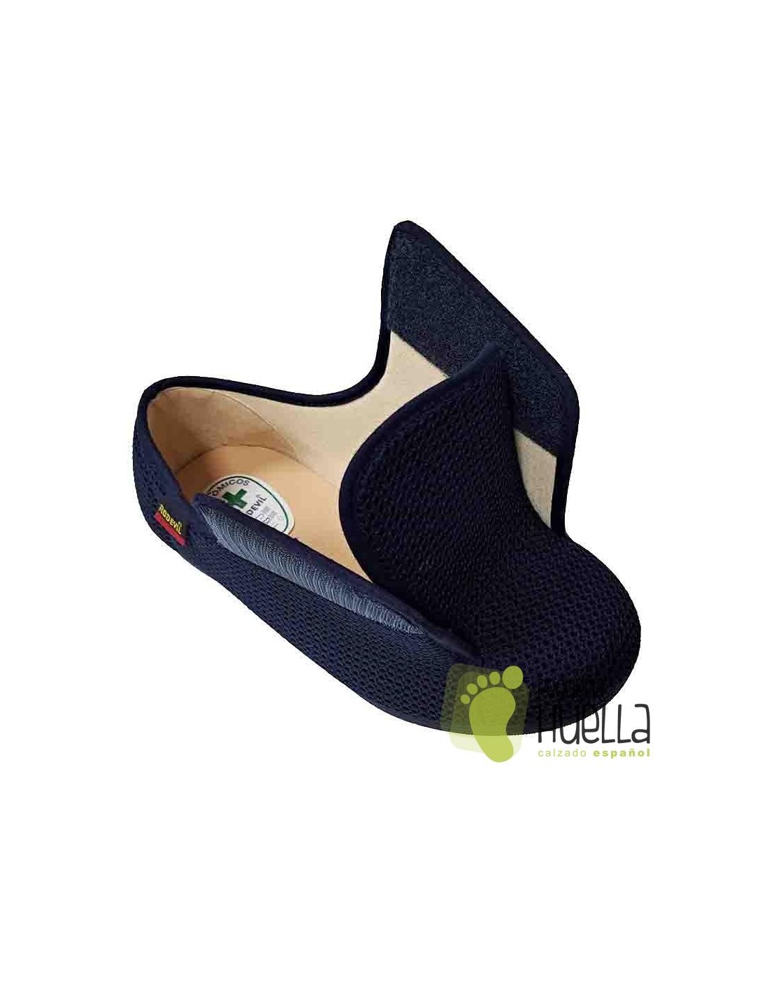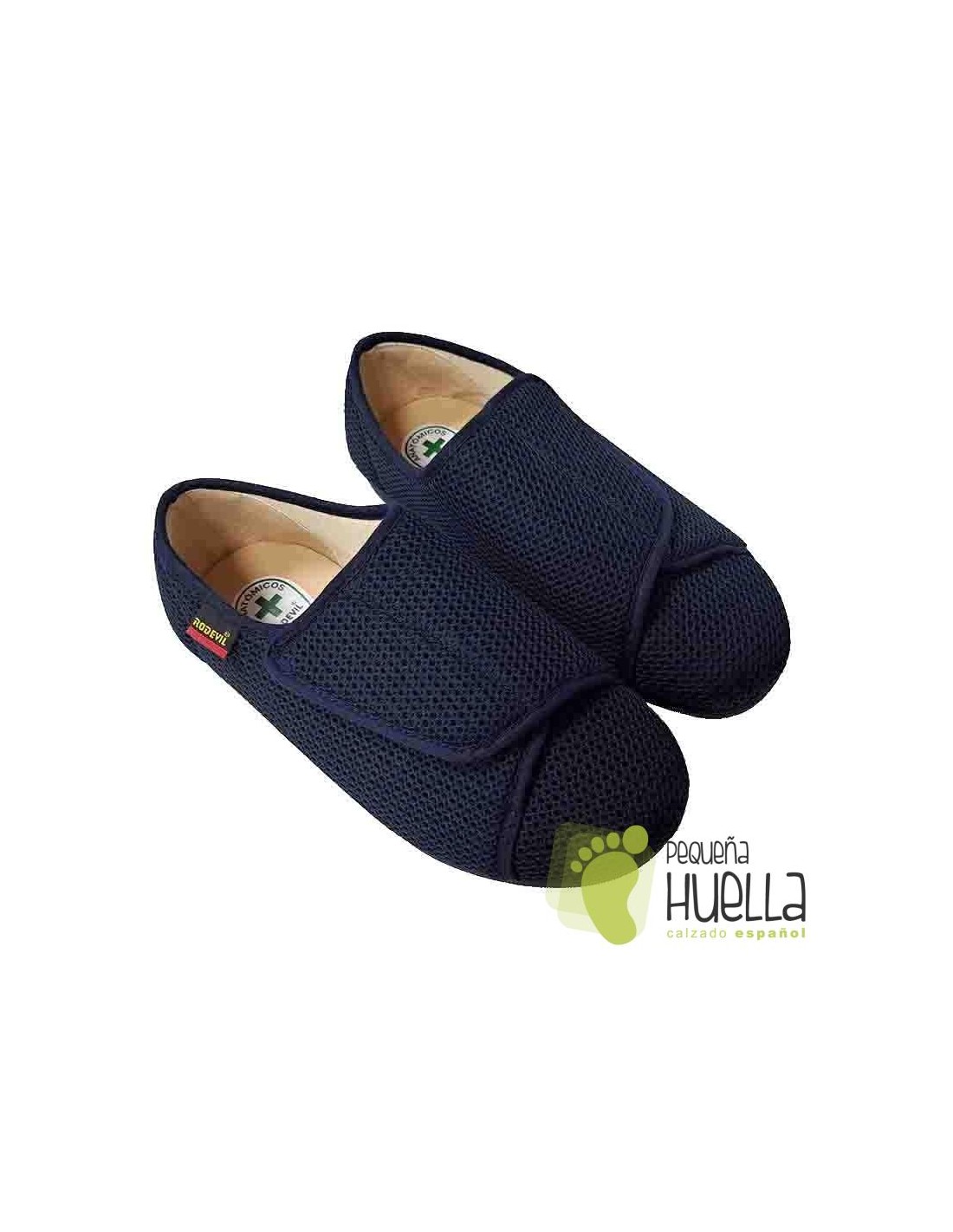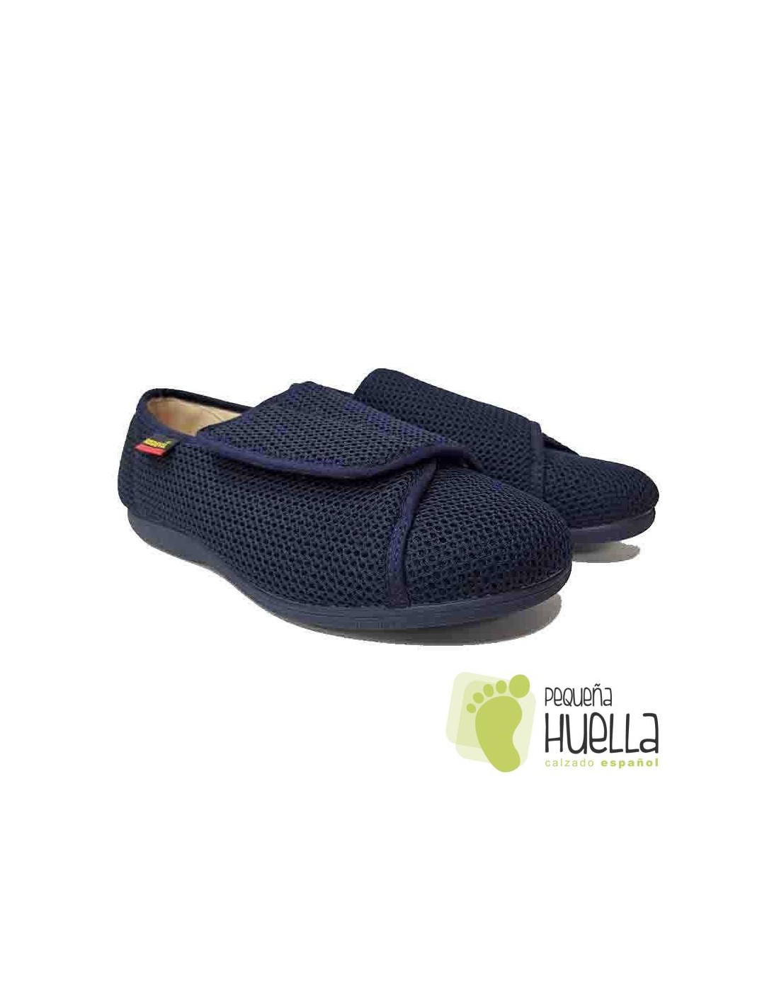 Zapatillas anatómicas para la calle o para casa de caballero en tejido de rejilla azul marino. Gran apertura para pies operados o pies hinchados o anchos. Horma ancha y se ajustan perfectamente con tres velcros sobre el empeine. Zapatillas de hombre muy fáciles de calzar y quitar, en especial para las personas operadas. Modelo muy solicitado para residencias de mayores.